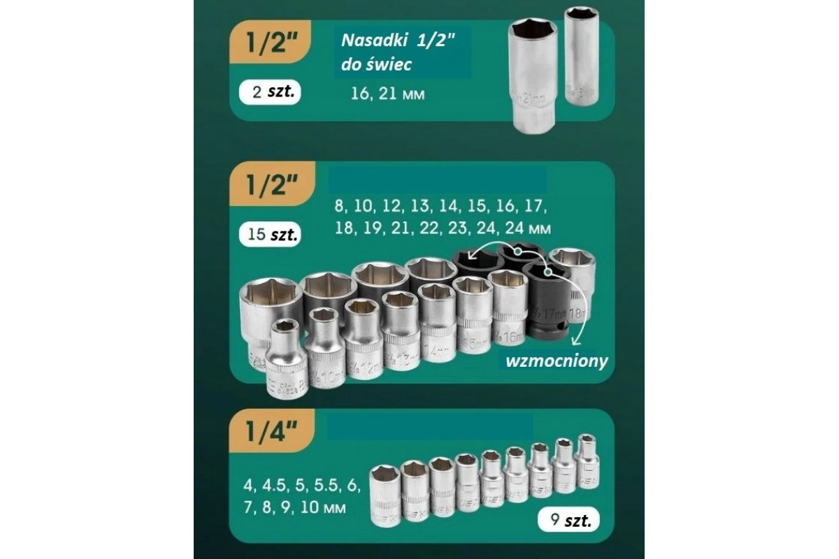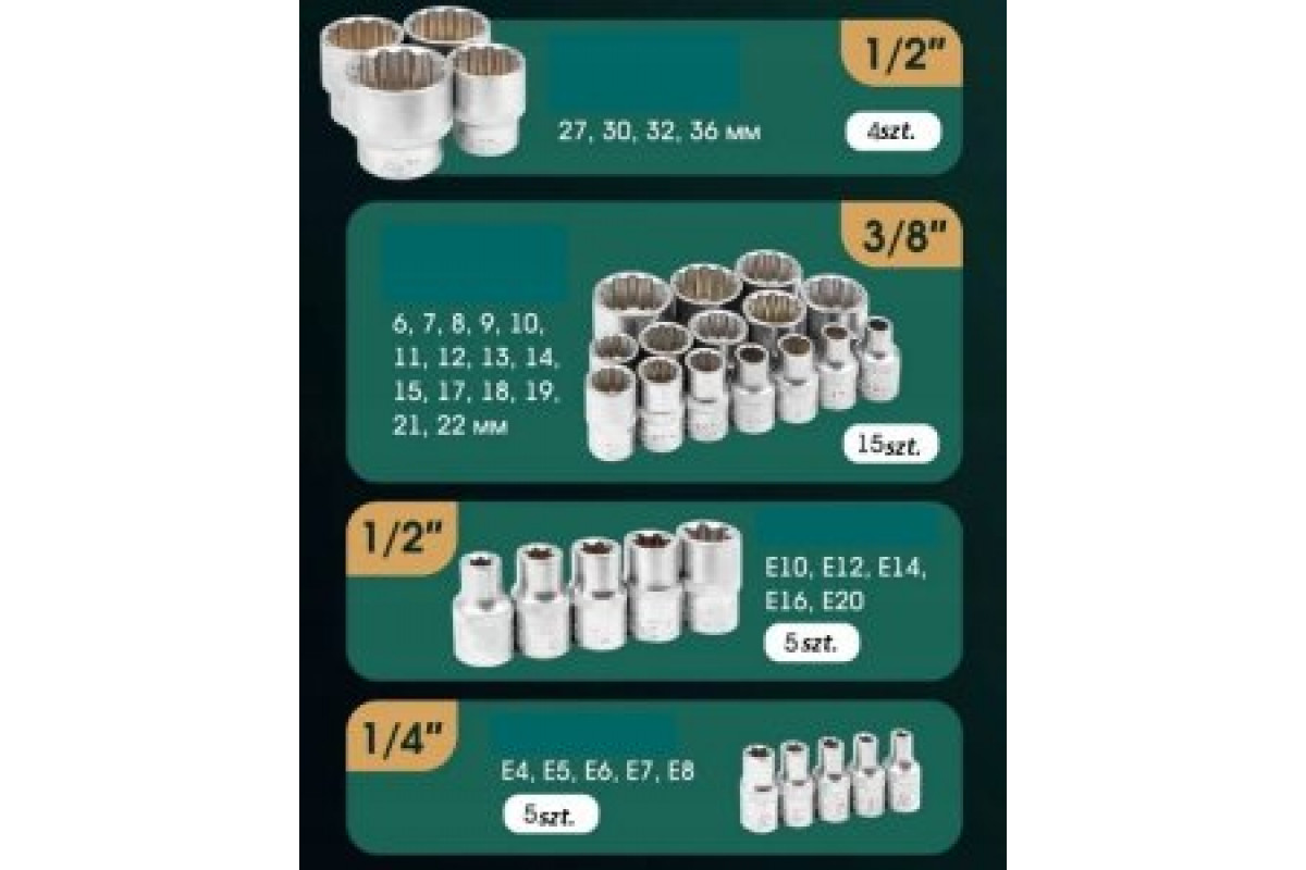 142+6el. 1/4", 3/8" i 1/2" (6-kątnych i 12-kątnych) (4-36mm)