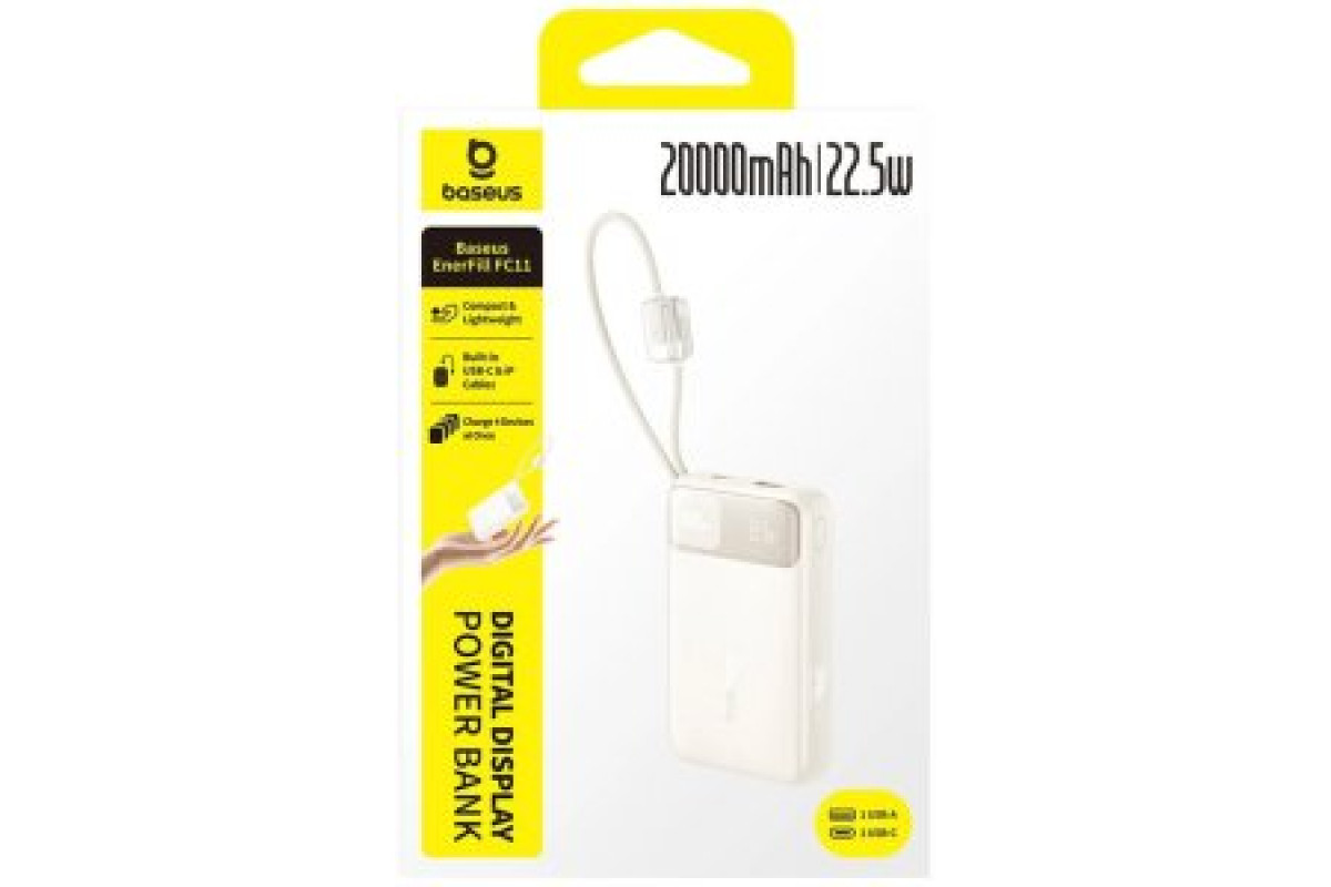 Baseus EnerFill FC11 20000mAh 22.5W ar displeju cyfrowym i dwoma wbudowanymi kablami - beżowy