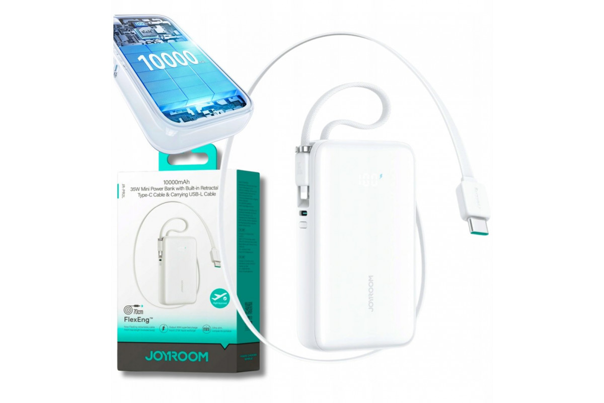Joyroom JR-PR2L 10000mAh 35W with a built-in zwijanym kablem USB-C i kablem-smyczą Lightning - biały