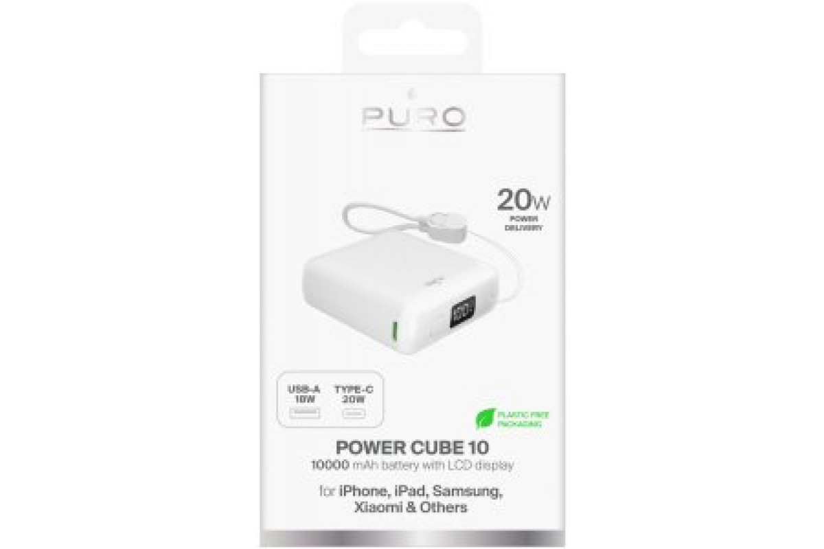 Puro 10000mAh 20W USB-C USB-A ar displeju i wbudowanym kablem USB-C - biały