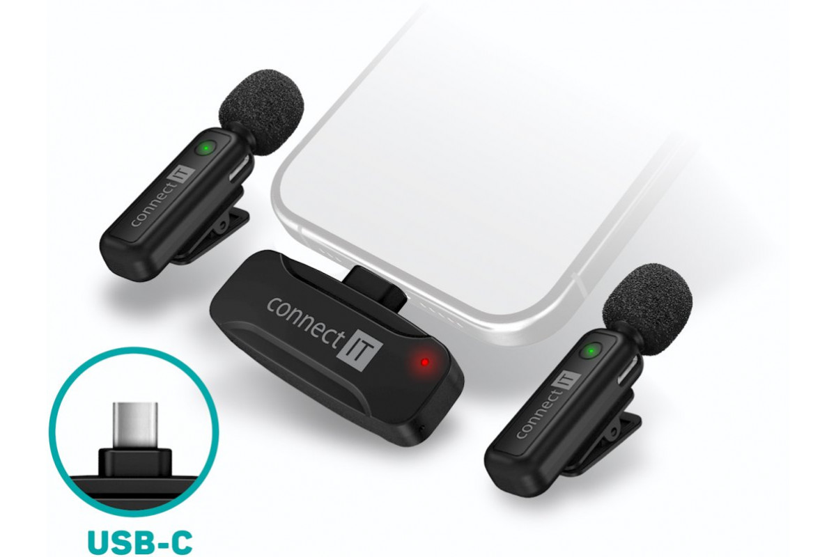 Connect IT ClipMic, Bezprzewodowy mikrofon lavalier z odbiornikiem, złącze USB-C, czarny