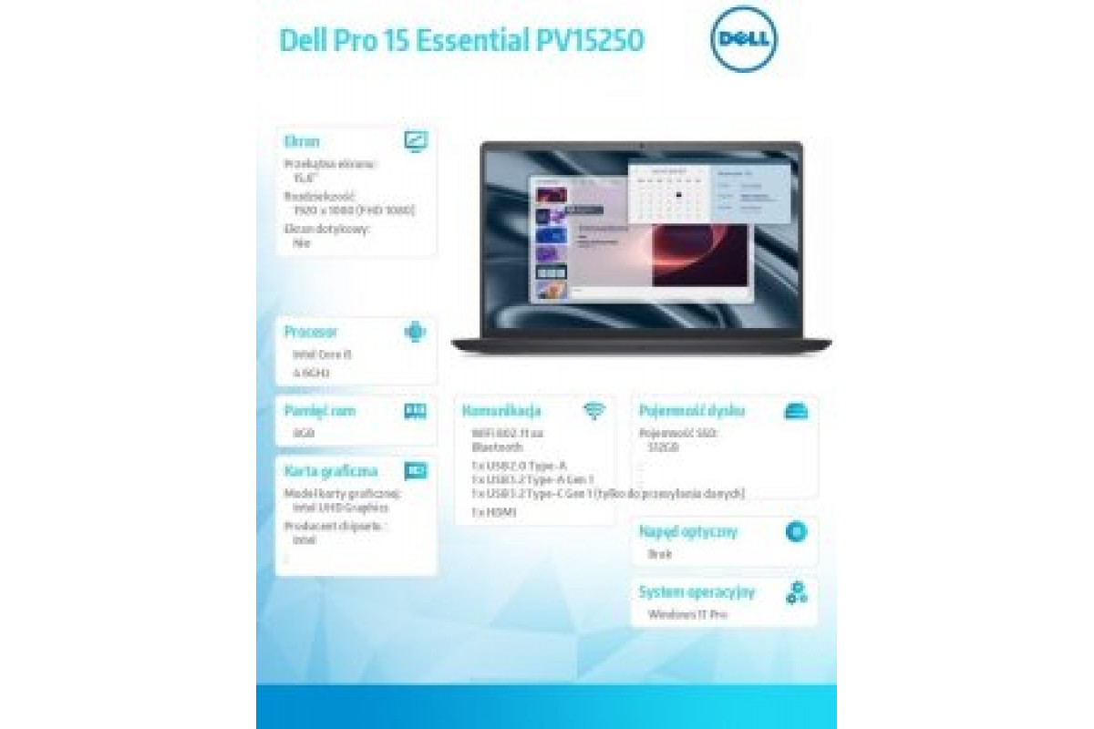 Laptop Dell Pro 15 Essential PV15250 i5-1334U / 8 GB / 512 GB / Windows 11 Pro (PV15250_RPLU_001_P)