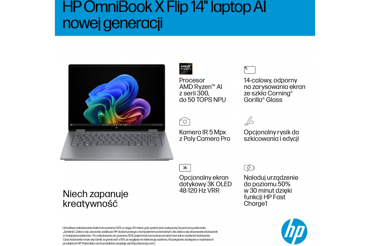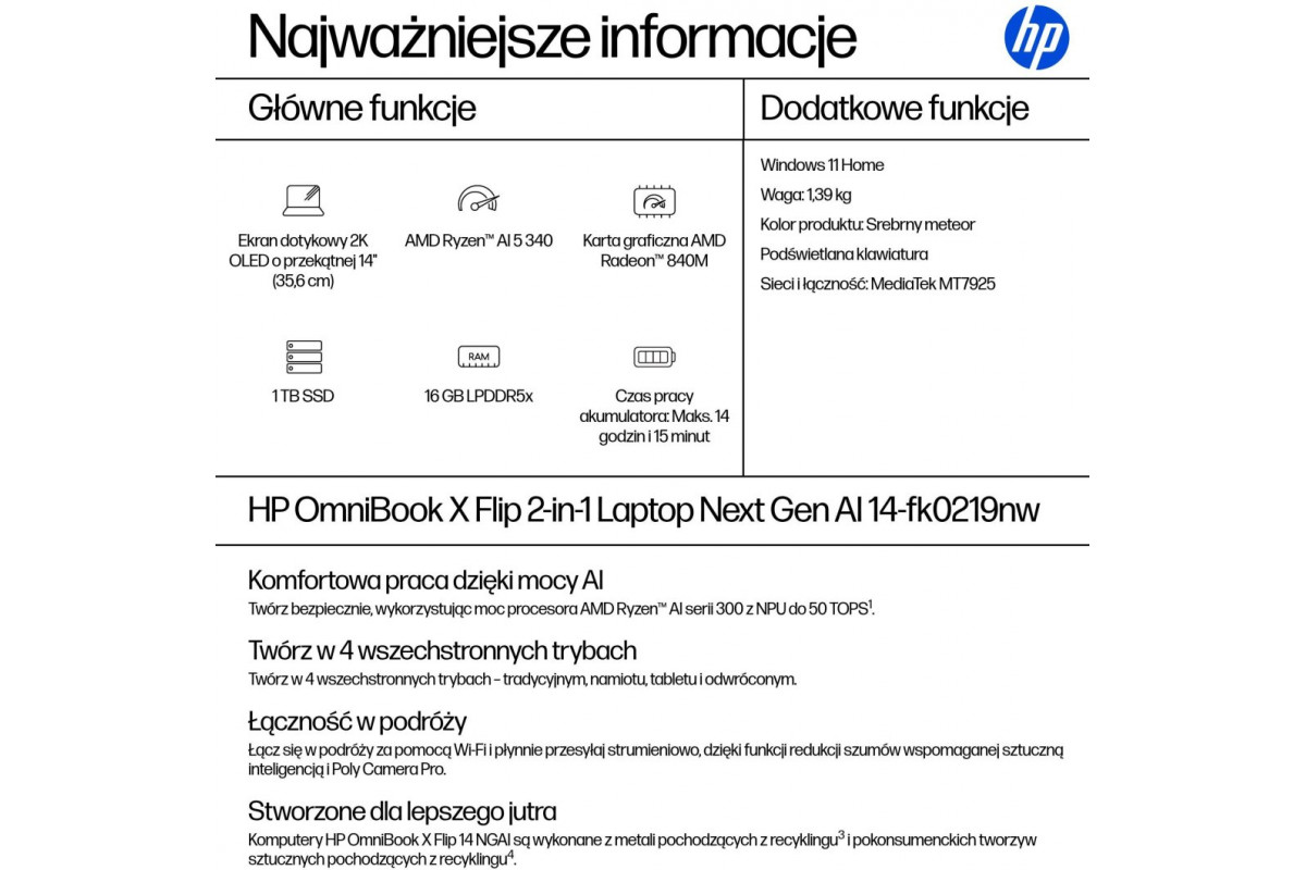 Laptop HP OmniBook X Flip 2-in-1 NG AI 14-fk0219nw - Ryzen AI 5 340 | 14"-2K-OLED-Touch | 16GB | 1TB | Win11Home | Meteor silver