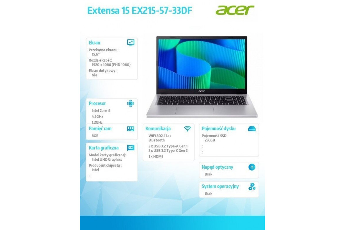 Notebook Extensa 15 EX215-57-33DF i3-1315U 15.6 FHD, 8GB DDR5, 256GB SSD, NoOS, srebrny