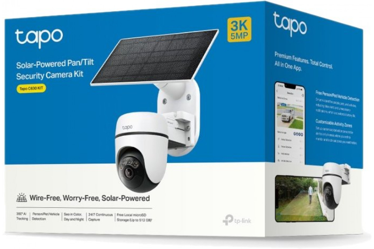 TP-Link Tapo C630 KIT kamera zewnętrzna, panel słoneczny (5MP, 3K, 1620p, IR 16m, WiFi, micro SD card, IP65)