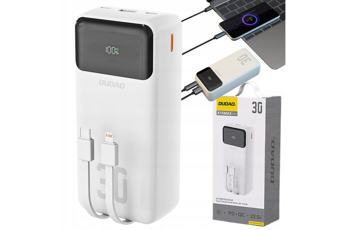 Dudao Dudao K15Max 30000mAh PD 22.5W kablami USB-C i Lightning - White