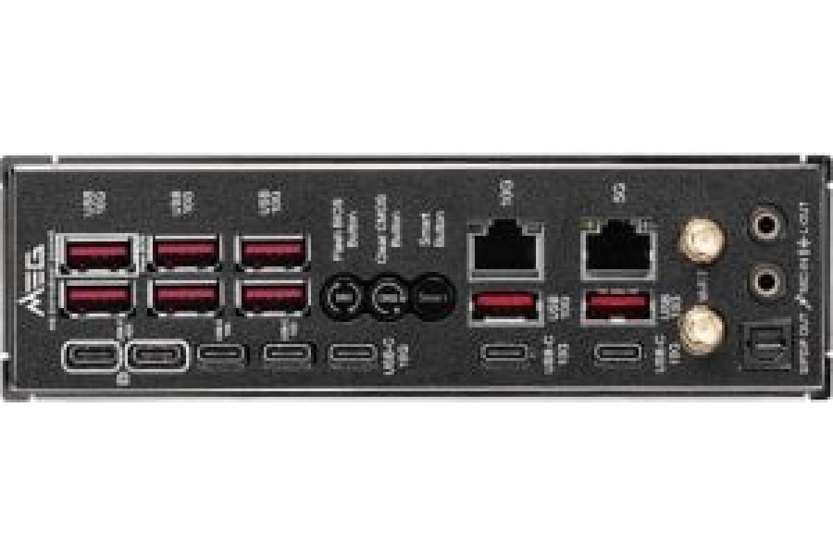 Poga BIOS Flashback x1 Poga Clear CMOS x1 Poga Smart x1 RJ-45 x1 S/PDIF Optiskais x1 USB 3.2 Gen 2 (3.1 Gen 2) x8 USB-C 3.2 Gen 2 (3.1 Gen 2) x5 USB4 x2 Matesplates savienotājs anteny WiFi x2 Matesplates savienotājs audio x2
