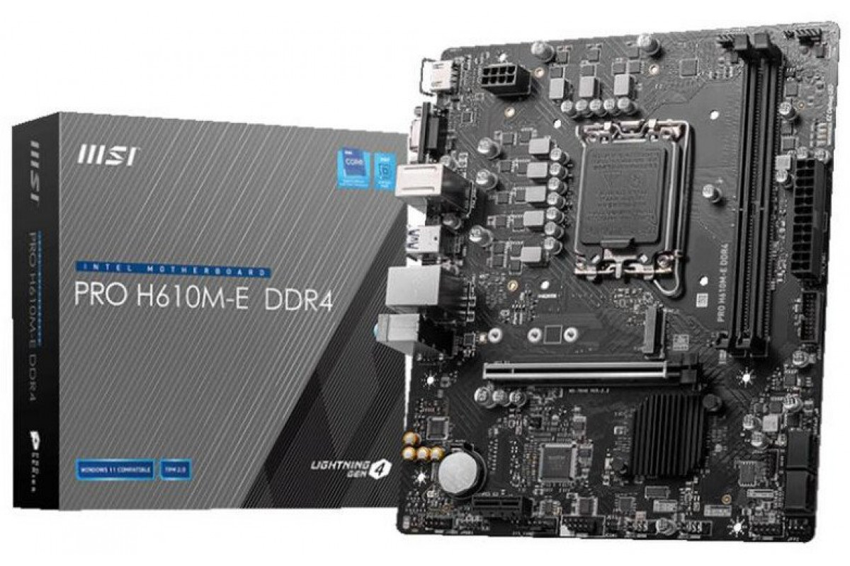 MSI PRO H610M-E DDR4 | Processor family Intel | Processor socket LGA1700 | DDR4 DIMM | Memory slots 2 | Supported hard disk drive interfaces SATA, M.2 | Number of SATA connectors 4 | Chipset Intel H610 | Mirco-ATX
