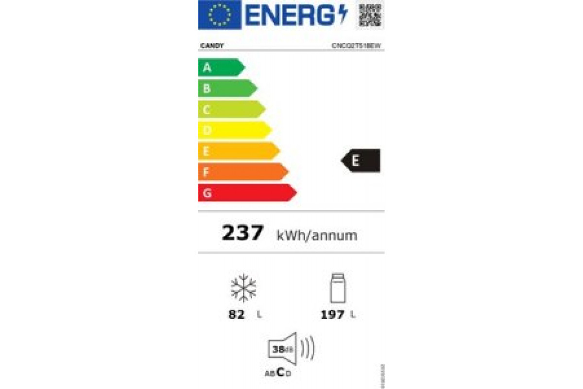Candy Candy Refrigerator | CNCQ2T518EW | Energy efficiency class E | Free standing | Combi | Height 182.5 cm | No Frost system | Fridge net capacity 197 L | Freezer net capacity 82 L | Display | 38 dB | White